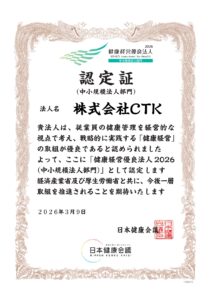 この度、株式会社CTKは「健康経営優良法人2026」の認定をいただきました。